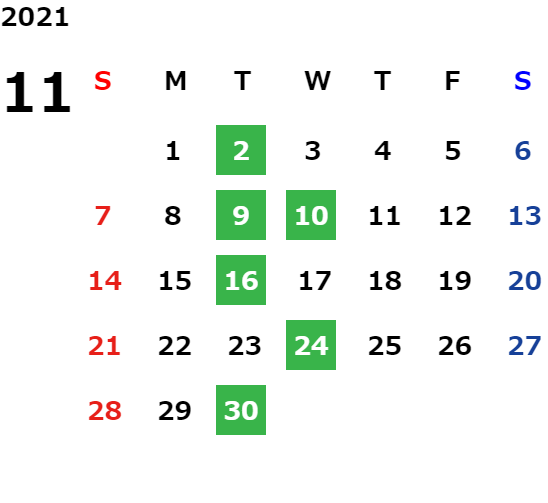 11月はカレンダーの■で色付けされたお日にちとが定休日となります