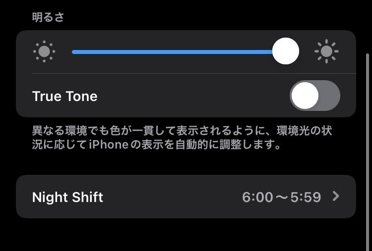 Night Shiftをオンにすると画面が薄いオレンジ色(?)になり、目への負担を減らしてくれます。画面下の色温度で「濃さ」も調整できます。最初は違和感を覚えるかと思いますが、使っていると少しづつ慣れていきます。慣れた後にNight Shiftをオフにするとすごく眩しいです(すぐオンにした!)。