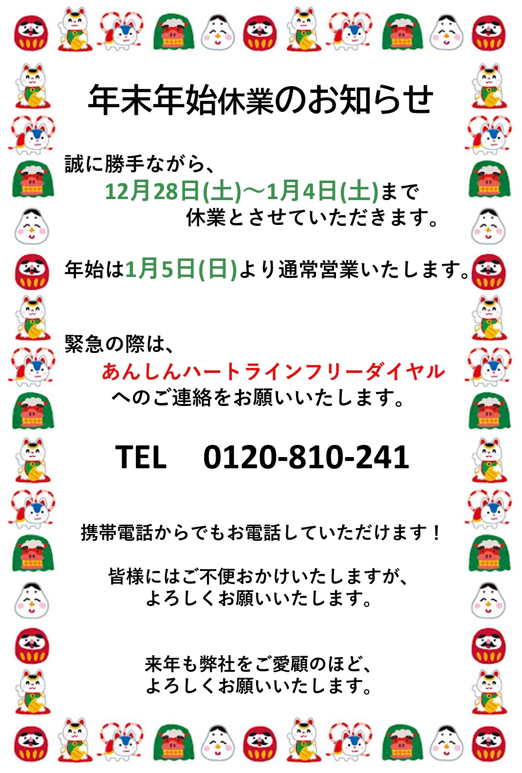 年末年始 営業日のご案内🚙 2024.12.27 トヨタ トヨタカローラ カローラ神戸 営業カレンダー 営業日 年末年始 アクア みなさまこんにちは! いつもブログを見ていただきありがとうございます。 2024年も終わりに近づいてきましたね。 今年も大変お世話になりありがとうございました。 寒さも本番! 引き続き お出かけの際はあたたかくしてお過ごしくださいね。 みなさまどうぞよいお年をお迎えくださいね🌞 緊急時のお問い合わせは あんしんハートラインまで🍀 0120-810-241 🚙伊丹店の試乗車🚗 試乗予約はコチラ🚗から 伊丹店のホームページは コチラ から👐 Line de Link のご登録は コチラ から🌈 前の記事へ 店舗ブログ一覧に戻る 次の記事へ